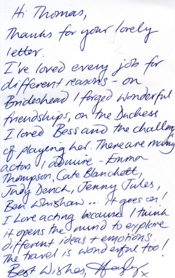 After seeing her in 'The Duchess' I was so impressed by her, I just had to write her something, because in my opinion she's very talented and I hope she'll have a great career. So I instantly sent her a letter with some questions about her work, whom she admires and what she likes about her work as an actress and expressed my admiration for her as an actress...so I'm very happy with this response as she answered everything on the backside of the photo she sent, and I hope to see her soon in more movies and challenging roles.