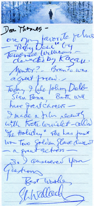comments I asked some questions in my letter, I sent to him, and he answered them all ! I wanted to know what his favourite movie, he was in, is, and it's 'Baby Doll' (1956). I also wanted to know if there are actors that he considers to be a role model for his own work or somebody that was a mentor to him, but as he wrote 'Mentor ?' and mentions Marlon Brando there doesn't seem to be a real mentor to him. And I wanted to know what actors from nowadays he likes and admires, so that's why he mentions Johnny Depp, Sean Penn (wrong spelling, but hell, the man was already 93 when he wrote this !) and Kate Winslet. Wonderful response from a great actor ! I liked him most in 'Misfits' (1961), 'The Good, the Bad and the Ugly' (1966) and 'The Holiday' (2006) he was married to actress Anne Jackson (* 03. September 1926) since 05. March 1948 until he died has 2 daughters, Roberta (* 02. August 1955) and Katherine (* 13. July 1958) and a son, Peter (* 20. February 1951) |